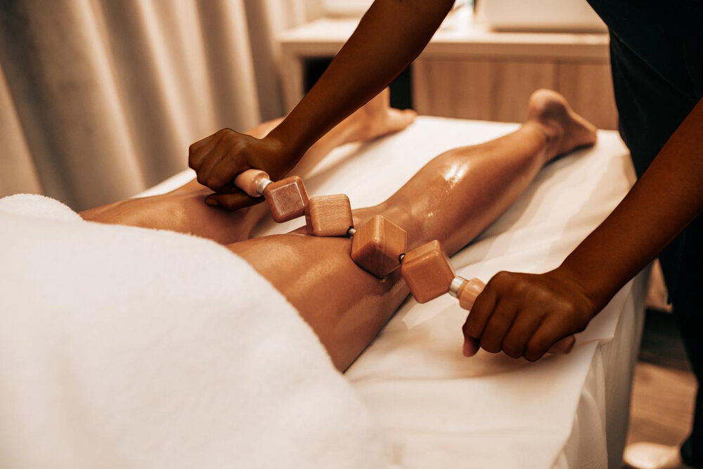 Manual contouring with wooden tools to target cellulite, stimulate lymphatic drainage, and smooth the body.
